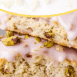 Reheat scones in a 350ºF oven for about 5 to 7 minutes until warm and lightly crisp on the outside. Avoid microwaving as it can make them soggy. After reheating, drizzle the pistachio glaze for that full fresh-baked experience.