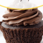 A single chocolate cupcake sits on a white plate with a white marbled texture background. The cupcake has a dark brown, textured base, topped with a thick swirl of smooth, rich chocolate frosting being piped from a metal nozzle at the top. The frosting is layered in tight, creamy loops creating a pointed peak. On the left side, the text reads