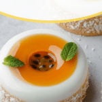 Now, it’s time to bring this dessert to life. Using a Silikomart Color mold or similar, start by piping the coconut panna cotta mixture into the center of each cavity, then fill the outer ring with more coconut panna cotta. Freeze for 15 minutes to allow it to set slightly. Meanwhile, stir the remaining coconut mixture occasionally at room temperature so it stays fluid. Once set, pipe the passion fruit panna cotta on top and freeze for another 30 minutes, stirring the leftover coconut mix intermittently. Finally, pipe the remaining coconut panna cotta on top and freeze for a minimum of 6 hours — overnight is even better for that perfect texture.