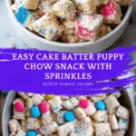 Fun and Sweet Cake Batter Puppy Chow is a delightful no-bake snack that combines crunchy rice cereal with melted white chocolate, cake mix, powdered sugar, and colorful sprinkles for a festive and tasty treat. Perfect for parties, holidays, or gifting, this easy-to-make sweet snack comes together in just 10 minutes.