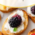 - Assemble Crostini: Once the bread slices are toasted and slightly cooled, spread a generous layer of the goat cheese and honey mixture onto each slice. Top each with the sliced fruit of your choice, such as strawberries, blackberries, and peaches for a fresh, vibrant taste.