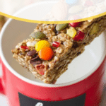 A granola bar with a rough texture on top, containing colorful candy pieces, pumpkin seeds, sliced almonds, and oats, rests across the rim of a red mug with the word
