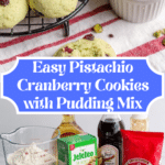 Delightfully soft and flavorful pistachio cookies infused with almond and vanilla extracts, studded with roasted pistachios and dried cranberries for a perfect balance of sweetness and crunch. These cookies feature pistachio pudding mix to enhance the nutty flavor and a hint of green for festive appeal.