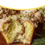 The image shows golden muffins with a crumbly, light brown top layer of streusel sprinkled with small green pistachio bits. One muffin is torn in half at the front, revealing a soft and fluffy yellow inside with a spiral of cinnamon or similar spice in the middle. The muffins have a light white glaze drizzled unevenly on top. They sit on a round wooden plate, surrounded by green fir branches and a white marbled surface underneath. Photo taken with an iphone --ar 4:5 --v 7