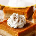 These Pumpkin Pie Bars combine a buttery shortbread crust with a rich, creamy pumpkin pie filling, topped with a dollop of homemade whipped cream. Perfectly spiced with cinnamon and pumpkin pie spice, this dessert is an easy-to-make alternative to traditional pumpkin pie that offers a delightful texture and flavor perfect for fall gatherings or holiday celebrations.