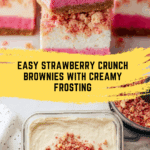 Strawberry Crunch Brownies are a delightful twist on classic brownies, featuring a moist strawberry-flavored base studded with creamy white chocolate chips, topped with a luscious cream cheese frosting and finished with a crunchy strawberry syrup-coated vanilla cookie crumble. Perfect for parties or a sweet treat anytime.