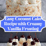 This delicious Coconut Cake features a light and fluffy cake infused with coconut milk and shredded coconut, topped with a creamy vanilla buttercream frosting and finished with toasted sweetened shredded coconut on the sides for added texture and flavor. It’s a perfect dessert for coconut lovers and special occasions.