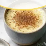 A cozy and creamy vegan eggnog made with oat milk and coconut cream, flavored with warm cinnamon, nutmeg, and vanilla. This dairy-free and egg-free holiday beverage is easy to prepare on the stovetop and perfect for anyone looking for a plant-based twist on the classic festive drink.